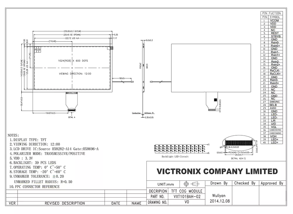 VxT101BAH-02 TFT-LCD modulua da. TFT-LCD panel bat, gidaria IC, FPC, atzeko argi unitatez osatuta dago. 10.1 pantaila-eremuak 1024 x 600 pixel ditu eta gehienez 16,7 milioi kolore ditu. Produktu honek RoHS ingurumen irizpidearekin bat dator