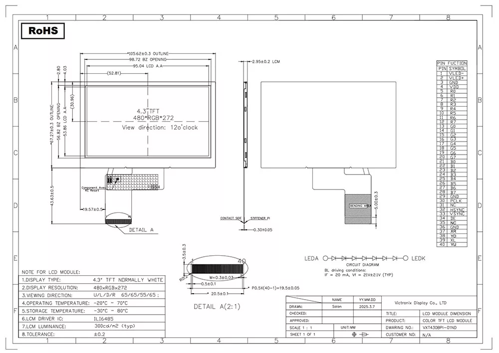 TFT LCD kristal likidoen pantaila mota da, film mehe transistore teknologia irudiaren kalitatea hobetzeko erabiltzen duena, eta eguneroko bizitzan aplikazio ugari ditu. Txinan TFT moduluen fabrikatzaile eta hornitzaile profesional gisa, zerk egiten du Victronix 480 × 272 Industrial TFT modulua beste fabrikatzaile batzuengandik desberdina? Lehenik eta behin, 300cd / m²-ko distira tipikoa eskaintzen du, 65 ° -ko ikuspegi zabaleko angelua 12: 00etan eta 700: 1 arteko kontraste-erlazioa, hainbat angeluetatik irakurgarritasun bikaina bermatuz. Bigarrenik, 7S1P-White LEDak erabilitako argiztapen unitate bat integratzen du, 30.000 eta 50.000 orduko bizimodu tipikoarekin (% 50eko distira arte), argiztapen baldintza guztietan ikusgarritasun argia bermatuz. Gainera, RGB interfaze bat onartzen du ILI6485 kontroladorearekin. Horrez gain, ingurumeneko proba zorrotzak gainditzen ditu, shock termikoak (-30 ° C ↔ + 80 ° C ↔ + 80 ° C-k barne), hezetasun biltegia (60 ° C / 90% RH) eta bibrazio mekanikoa, tenperatura hedatuaren barrutian (-20 ° C eta 70 ° + 70 ° + 70 ° + 70 ºC) funtziona dezakeela ziurtatuz.