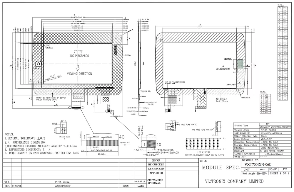 Victronix TFT moduluen fabrikatzaile profesionala da eta Txinan oinarritutako hornitzailea da. 18 urteko esperientzia du arlo honetan, hainbat eredu garatu ditugu. Gure produktu estandarrez gain, zerbitzu pertsonalizatuak ere eskaintzen ditugu gure bezeroen premia zehatzak asetzeko. Victronix 7 hazbeteko 1024 × 600 Normalean TFT LCD modulua kalitate handiko 7 hazbeteko TFT LCD modulua da, aplikazio industrialak eskatzeko. 1024 × 600 pixel (WSVGA) bertako bereizmena eskaintzen du, ikus-entzunezkoak, ikus-entzunezkoak eskaintzen ditu datu aurkezpen zehatza, erabiltzailearen interfazeak eta jarraipen zereginetarako.